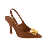 Este modelo tipo slingback presenta una punta afilada que estiliza visualmente la silueta del pie y un tacón alto y delgado con base ligeramente más ancha para mayor estabilidad. El color marrón aporta versatilidad y calidez, ideal para looks de temporada. En la parte delantera, se destaca un adorno metálico dorado en forma de lazo, que agrega un toque glamuroso y femenino. La tira trasera ajustable con hebilla dorada asegura un calce cómodo y firme.
