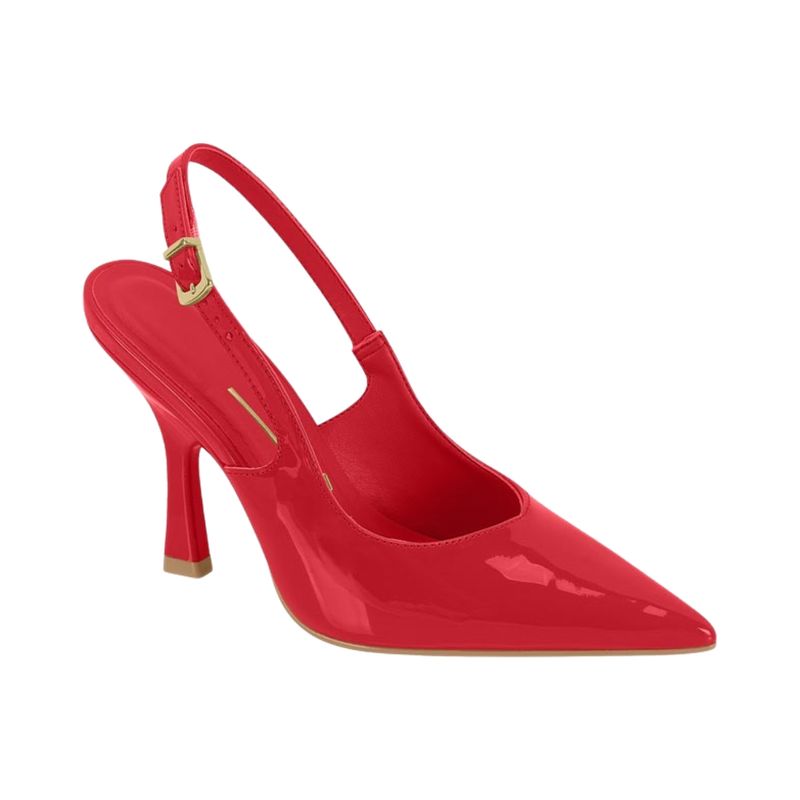 Este stiletto de tipo slingback presenta una punta afilada y un tacón alto y delgado de diseño tipo aguja con base ligeramente ensanchada, lo que aporta mayor estabilidad sin perder la sofisticación. Su acabado en color rojo brillante lo convierte en un calzado impactante, perfecto para realzar cualquier conjunto. La tira trasera ajustable con hebilla dorada asegura una sujeción cómoda y segura al caminar, mientras suma un detalle decorativo sutil.