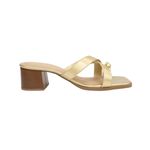 Sueco de tacón en bloque con acabado metalizado dorado, que combina sofisticación y glamour en un diseño moderno. Sus tiras cruzadas con estilo toe ring y detalle esférico aportan elegancia y un toque distintivo, ideal para complementar looks formales o salidas especiales.
