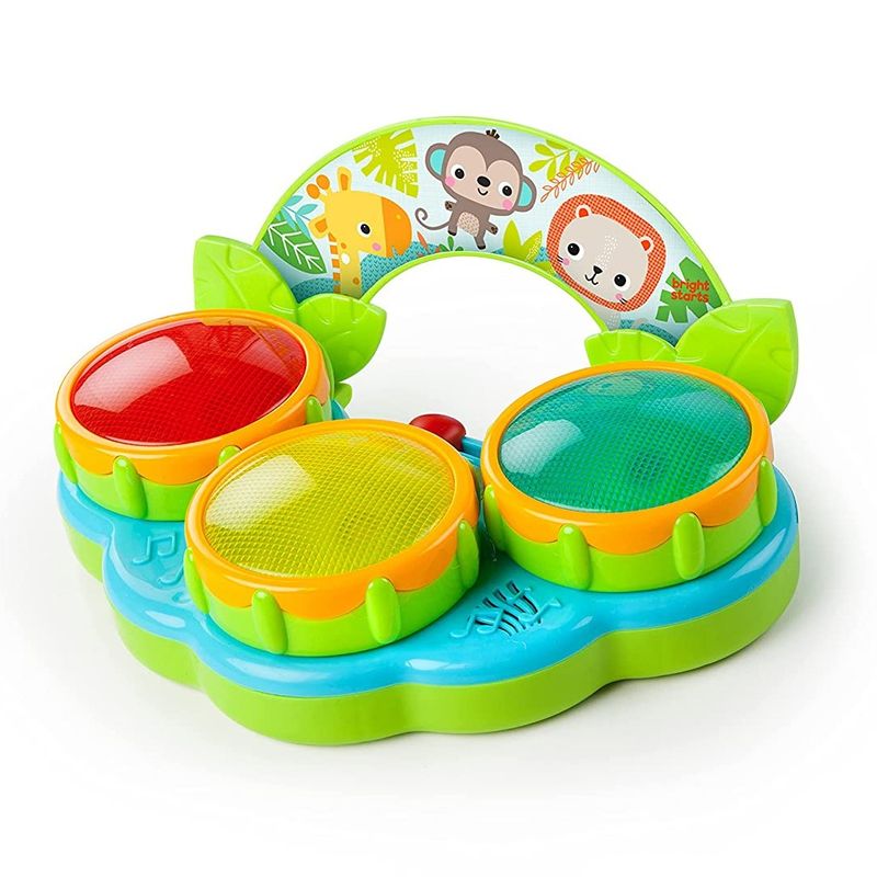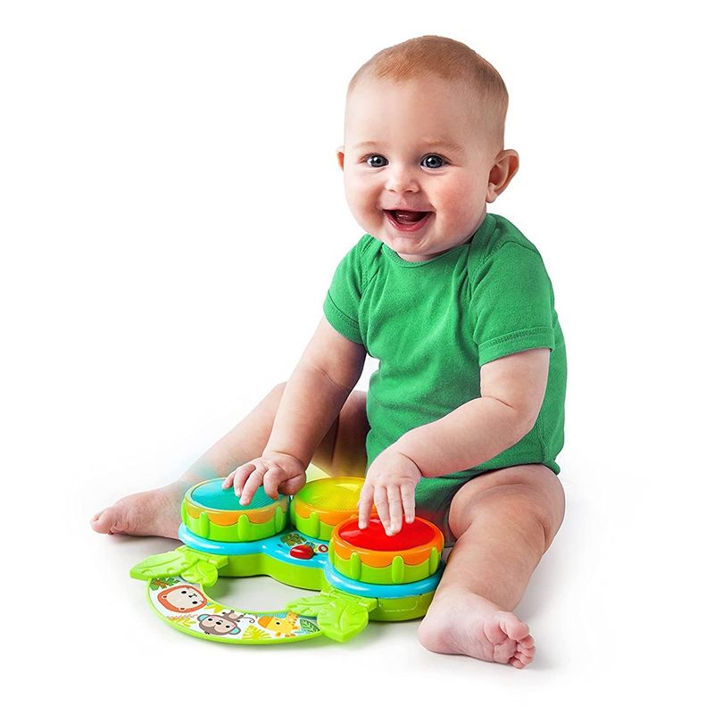 El bebé puede presionar cada uno de los 3 coloridos y luminosos tambores para activar sonidos de batería, melodías, sonidos divertidos y luces intermitentes.