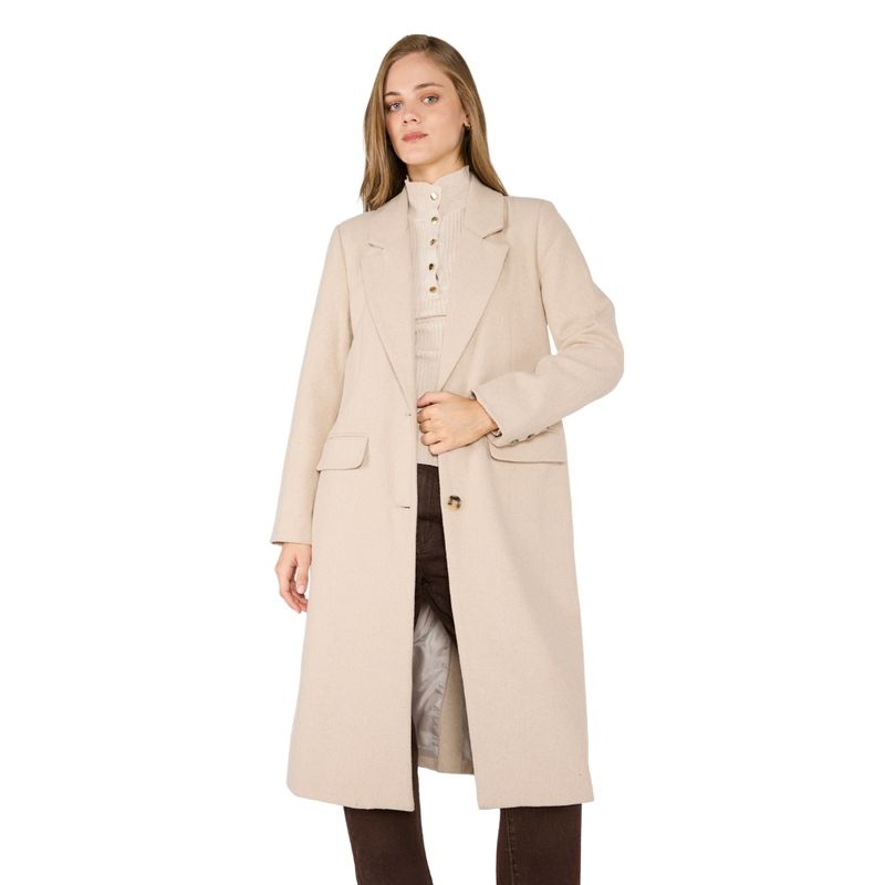 El Tapado Jacinta Arena presenta un diseño clásico y elegante, ideal para quienes buscan una prenda sofisticada y atemporal. Su corte largo estiliza la silueta, mientras que la solapa de muesca aporta un toque formal. Los bolsillos laterales con tapa y el cierre frontal con botones completan un diseño funcional que combina perfectamente con looks urbanos o formales.