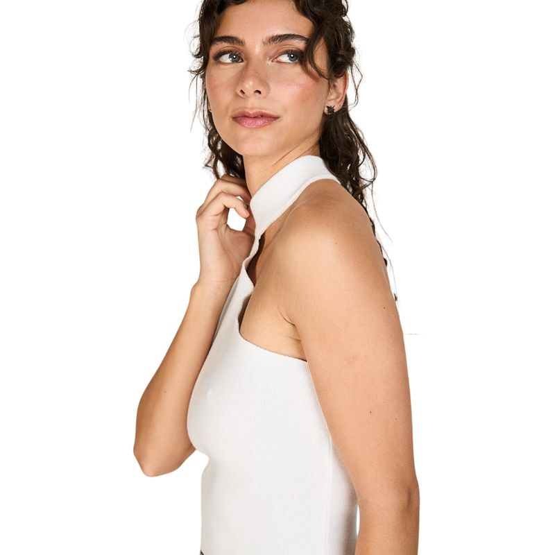 Su confección en tejido de punto acanalado garantiza un ajuste cómodo y favorecedor, adaptándose al cuerpo como una segunda piel. Gracias a su corte ajustado, este top es ideal para crear looks versátiles que se adaptan a diferentes ocasiones, desde salidas casuales hasta eventos especiales.