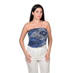 El Top Crop En Tull Estampado Azul Mujer Tiare es una prenda ligera y elegante, ideal para looks veraniegos y casuales. Su escote recto y fruncido sutil realzan la silueta, mientras que el estampado de pañuelo/bandana en tonos azul, blanco y negro aporta un toque moderno y sofisticado. La transparencia del tull le da un efecto delicado y femenino.
