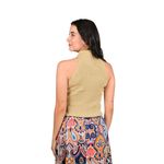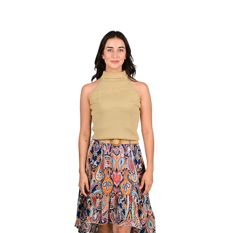 Este top de cuello alto presenta un elegante acabado en lurex dorado que aporta un toque de brillo y sofisticación al conjunto. Su diseño ceñido y moderno permite destacarse en eventos casuales, salidas nocturnas o reuniones donde se busca un look elegante y actual.