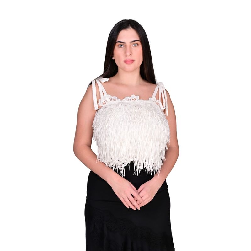 Este Top Marfil Con Flecos para mujer combina elegancia y originalidad, destacándose por su diseño único y sofisticado. Su cuerpo está completamente cubierto con flecos largos y finos, que aportan textura, volumen y un toque de dinamismo al movimiento. El escote recto está delicadamente adornado con un patrón floral en guipur blanco, de donde se desprenden los tirantes dobles atados con lazos, brindando un detalle femenino y elegante.