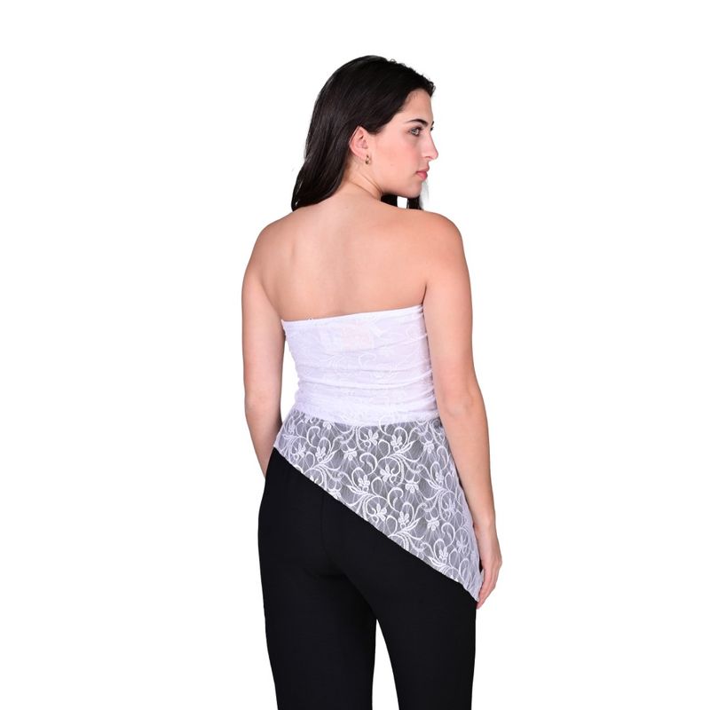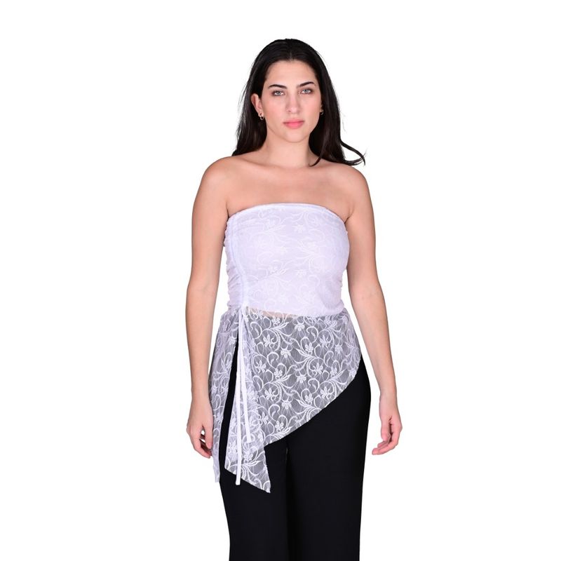 Confeccionado en tela de encaje con un fruncido ligero, el top presenta un panel asimétrico de encaje superpuesto que cae hacia un lateral de la cadera, generando un efecto de sobrefalda atada que aporta movimiento y un toque distintivo a cualquier conjunto.