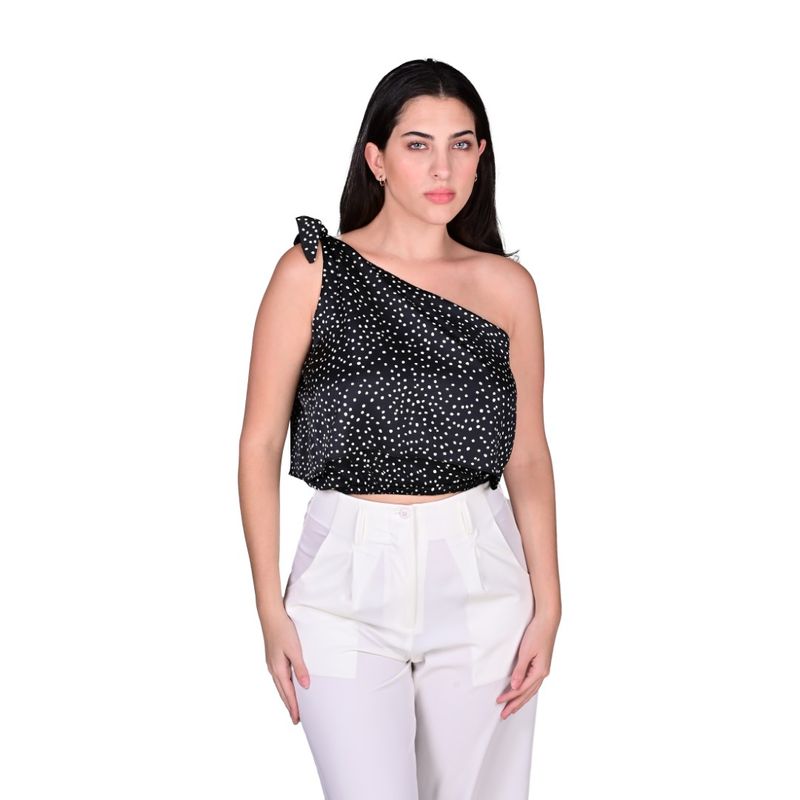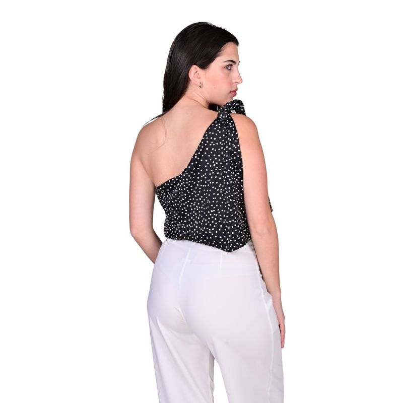 El top cuenta con un volante sutil que añade movimiento y volumen, mientras que el lazo decorativo en el hombro aporta un detalle delicado que resalta la elegancia de la prenda. Su estampado de motas blancas sobre fondo negro genera un contraste llamativo y moderno, perfecto para combinar con diversas piezas de vestuario.