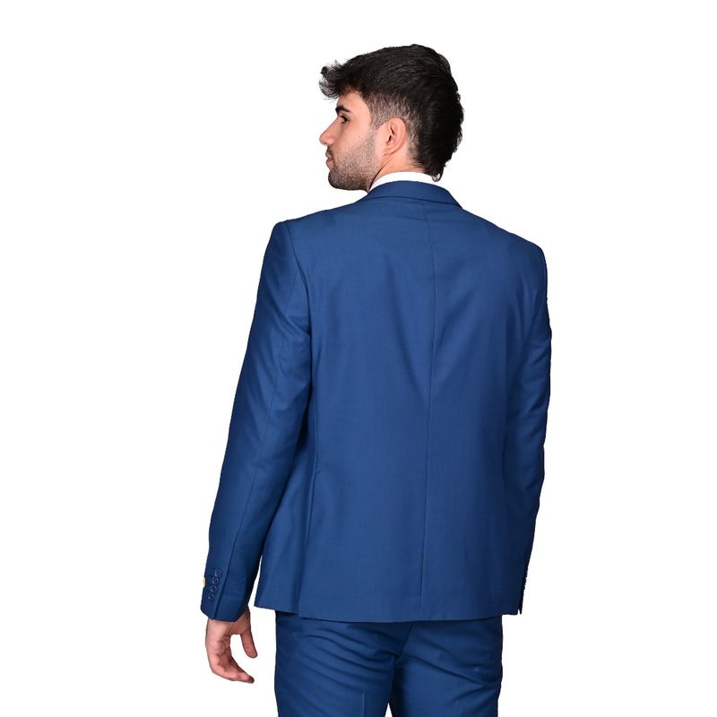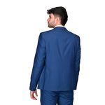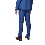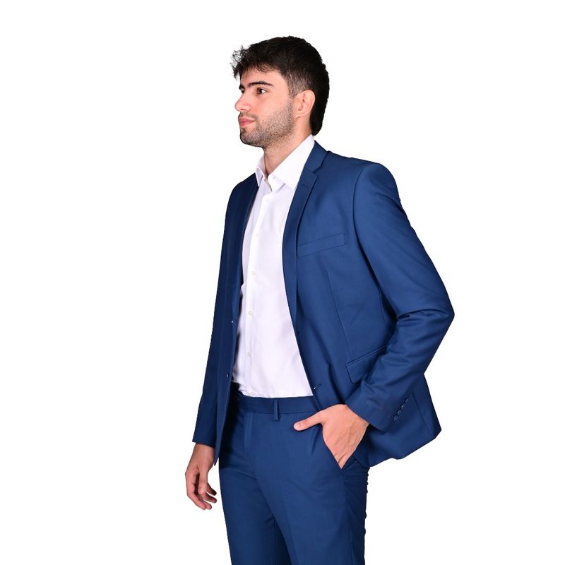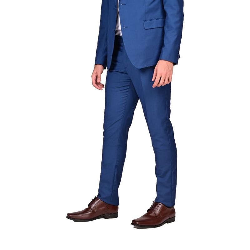 El pantalón en el mismo tono azul royal mantiene un corte moderno, recto o ligeramente slim fit, que se ajusta cómodamente a las piernas sin restringir el movimiento. Presenta presillas para cinturón y cierre frontal con botón y cremallera, asegurando un ajuste cómodo y seguro.