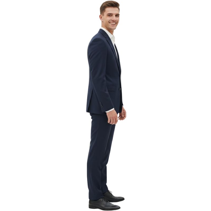 Traje de corte Slim, confeccionado en tejido Fantasy que aporta textura y distinción al diseño. Su ajuste moderno resalta la silueta, ofreciendo un look elegante y contemporáneo, ideal para eventos formales, reuniones de trabajo o celebraciones especiales donde se busca un estilo sofisticado y moderno.
