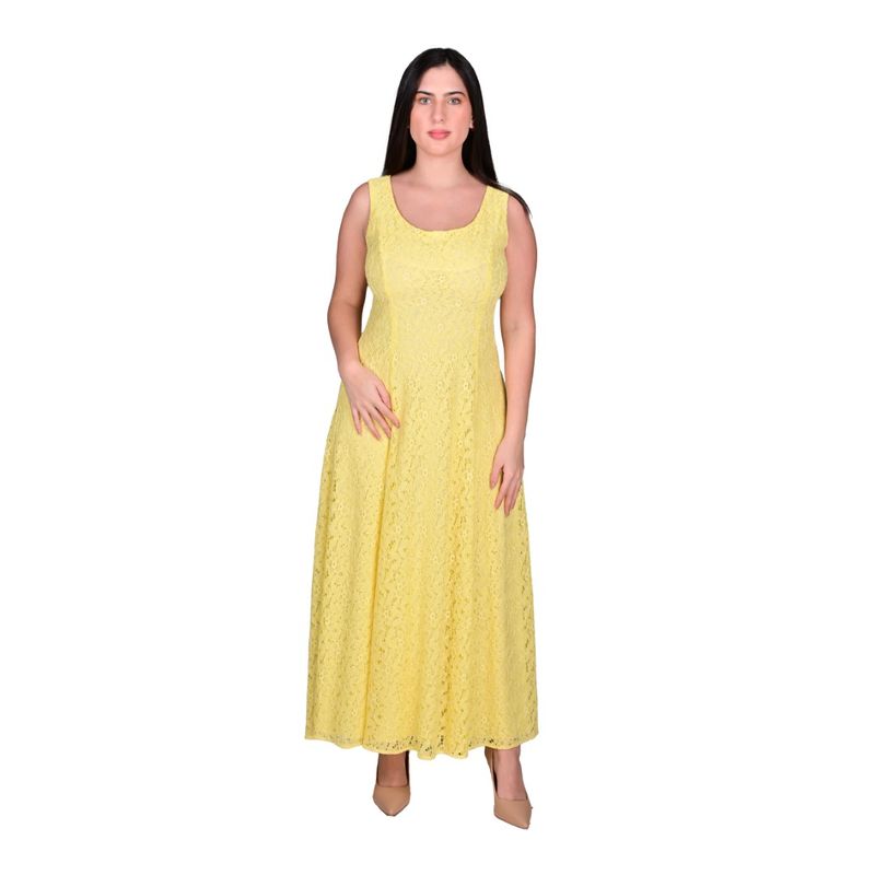 El vestido está confeccionado en una tela tipo encaje o crochet con un patrón de flores que cubre toda la prenda, desde el busto hasta el dobladillo. La falda amplia tiene un corte acampanado que cae hasta los tobillos, ofreciendo un movimiento fluido y un efecto elegante al caminar. La textura y el patrón floral aportan un acabado romántico y visualmente atractivo.