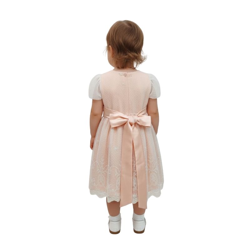 Este delicado vestido combina elegancia y comodidad, ideal para ocasiones especiales o eventos familiares. El diseño incluye tul en la falda, que aporta volumen y un toque de fantasía, mientras que la parte superior ofrece un ajuste suave y cómodo para la bebé.
