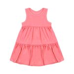 Este vestido sin mangas presenta un cuello redondo clásico y un diseño escalonado de volantes (tiers), con fruncidos en las costuras que crean una silueta suelta y acampanada, perfecta para el movimiento y la libertad de los más pequeños. Su color coral aporta un toque alegre y veraniego, fácil de combinar con accesorios y champion.