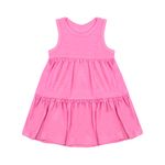 Este vestido sin mangas presenta un cuello redondo clásico y un diseño escalonado de volantes (tiers) con fruncidos en las costuras, que crean una silueta suelta y acampanada, brindando libertad de movimiento. Su color rosado aporta un toque dulce y veraniego, combinando fácilmente con accesorios y champion.