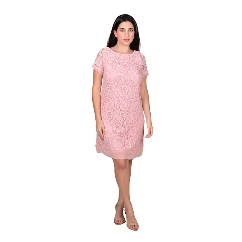El vestido de encaje rosa de L'Exclusif combina elegancia, feminidad y delicadeza en un diseño contemporáneo. La falda corta de corte recto, completamente forrada, presenta un tejido exterior de encaje floral que resalta por su detalle refinado, mientras que el borde de tela lisa semitransparente que llega justo por encima de la rodilla aporta un acabado sofisticado y ligero. Este vestido está diseñado para realzar la figura femenina sin sacrificar comodidad ni libertad de movimiento, siendo perfecto para ocasiones especiales y eventos formales.