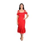 Vestido midi femenino en color rojo intenso, confeccionado en encaje de diseño elegante y sofisticado. Su corte tipo sirena entallado resalta la figura, mientras que el escote de hombros descubiertos aporta un toque atrevido y femenino. Los volantes estratégicamente ubicados en el pecho y el bajo de la falda brindan movimiento y delicadeza. Los tirantes con lazo ajustable añaden un detalle especial que hace de esta prenda la elección perfecta para fiestas, cócteles y eventos formales.