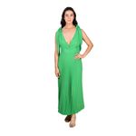 Este vestido en crepe laminado verde combina elegancia y movimiento con su falda midi plisada que aporta fluidez al caminar. Su escote en V profundo cruzado realza la zona del pecho y los tirantes anchos con lazo anudado en los hombros agregan un detalle delicado y femenino. La banda fruncida en la cintura define la silueta, brindando un ajuste favorecedor sin perder comodidad.