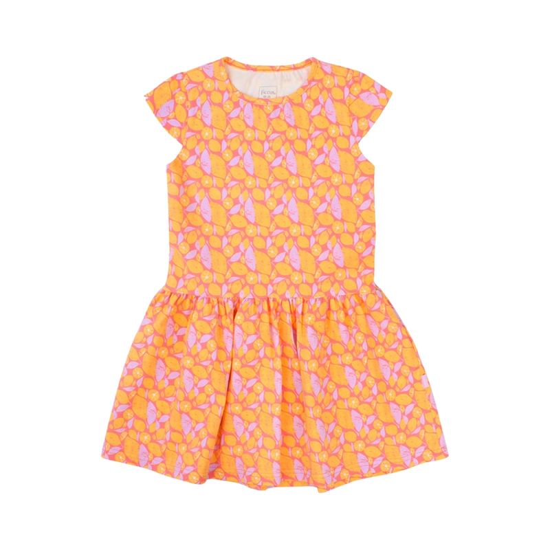 Este vestido de niña combina comodidad, color y un diseño alegre, ideal para el día a día urbano. Su color coral brillante sirve de base para un estampado continuo de limones y hojas en tonos vibrantes de naranja, rosa fuerte y lila, aportando un toque fresco y divertido al look infantil.