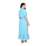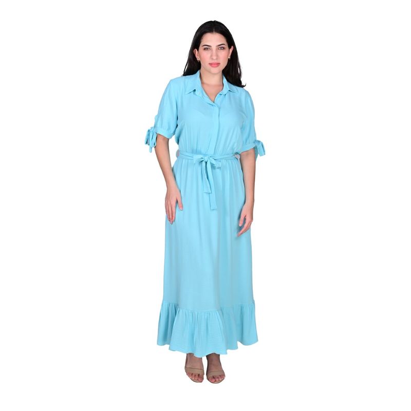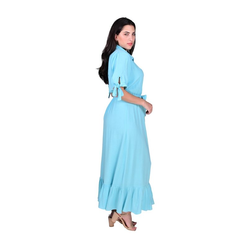 El vestido incluye un cinturón de lazo ajustable que realza la cintura y aporta definición a la silueta. Las mangas cortas con detalle de lazo suman un toque delicado y femenino, y el volante fruncido en el dobladillo añade movimiento y ligereza a la prenda. Su tono agua marina ofrece frescura y versatilidad, permitiendo combinaciones modernas y elegantes.