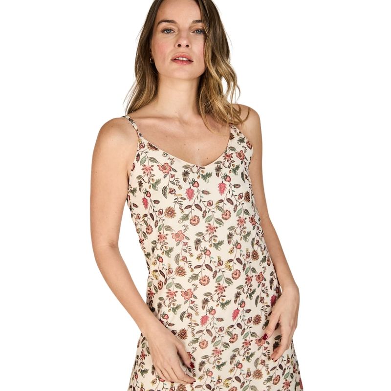 Estampado floral en tonos rojizos, verdes, blancos y marrones sobre fondo beige claro, aportando un toque femenino y versátil.