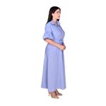 Confeccionado en un tejido celeste melange, el vestido presenta un tramado de hilos en distintos tonos de azul y blanco que le dan profundidad y textura visual. Su material duradero y suave ofrece comodidad, ligereza y frescura, ideal para el uso diario o salidas especiales.