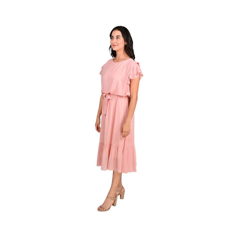 Cuenta con mangas cortas con volantes que aportan movimiento y un toque romántico. Su cuello redondo mantiene la simplicidad y elegancia, mientras que el lazo en la cintura permite ajustar la prenda para un look más definido y favorecedor. La falda posee un volante en el bajo que añade fluidez y sofisticación. En la espalda, se destaca una abertura con cierre de lazada que ofrece un detalle femenino y delicado.