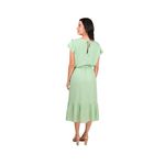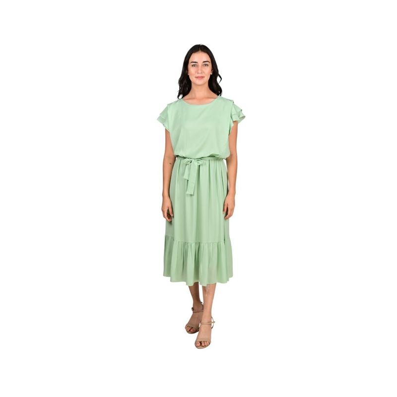Presenta mangas cortas con volantes que agregan movimiento y un toque romántico. Su cuello redondo mantiene la simplicidad del diseño, mientras que el lazo en la cintura permite ajustar la prenda para un look más definido y favorecedor. La falda cuenta con un volante en el bajo que aporta fluidez y estilo. En la espalda, se destaca una abertura con cierre de lazada que aporta un detalle elegante y femenino.