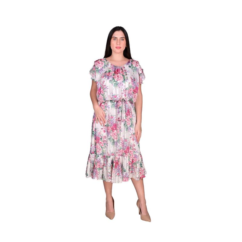 La prenda presenta un estampado de grandes flores en tonos rosa, lila y verde sobre un fondo blanco o crema, que realza la frescura y delicadeza del vestido. La cintura está marcada y fruncida mediante un cinturón de tela del mismo estampado, definiendo la figura. La falda con corte acampanado incluye pliegues y un volante en el dobladillo, añadiendo movimiento y elegancia a cada paso. El largo llega aproximadamente a la mitad de la pantorrilla, ofreciendo un estilo sofisticado y femenino.