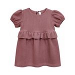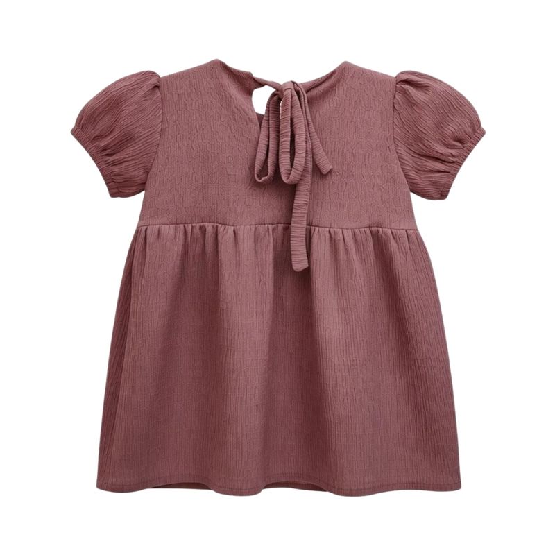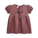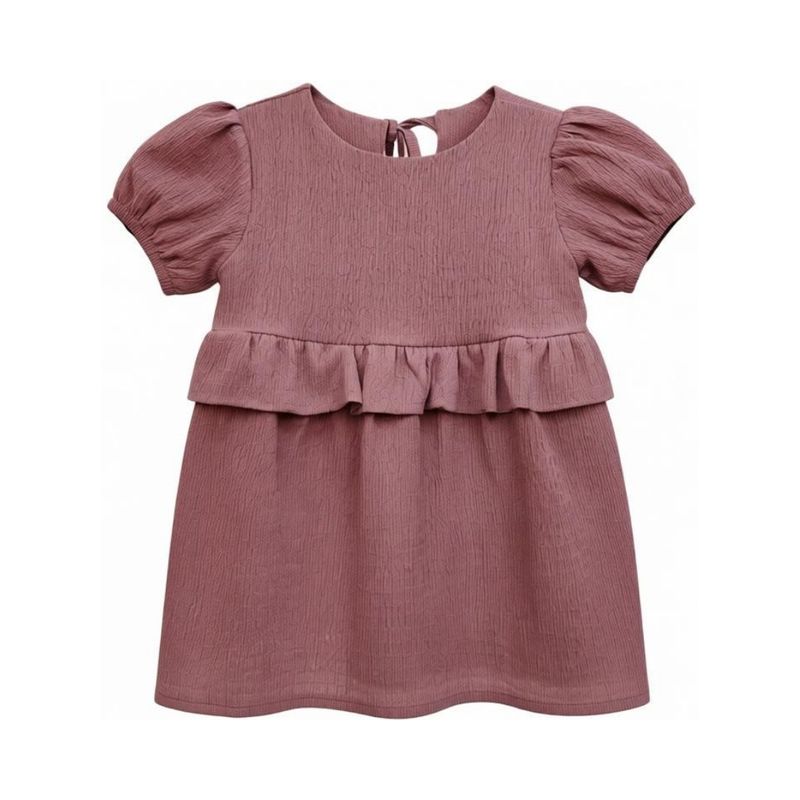 Este vestido de manga corta para niña ofrece un diseño delicado y elegante, ideal para el día a día o eventos especiales. Presenta escote redondo, mangas cortas abullonadas que aportan un toque femenino y un volante horizontal fruncido a la altura del pecho, creando un detalle encantador y coqueto. Su corte holgado permite libertad de movimiento, mientras que el lazo de amarre en la espalda agrega un detalle decorativo que también contribuye a un ajuste cómodo y seguro.