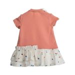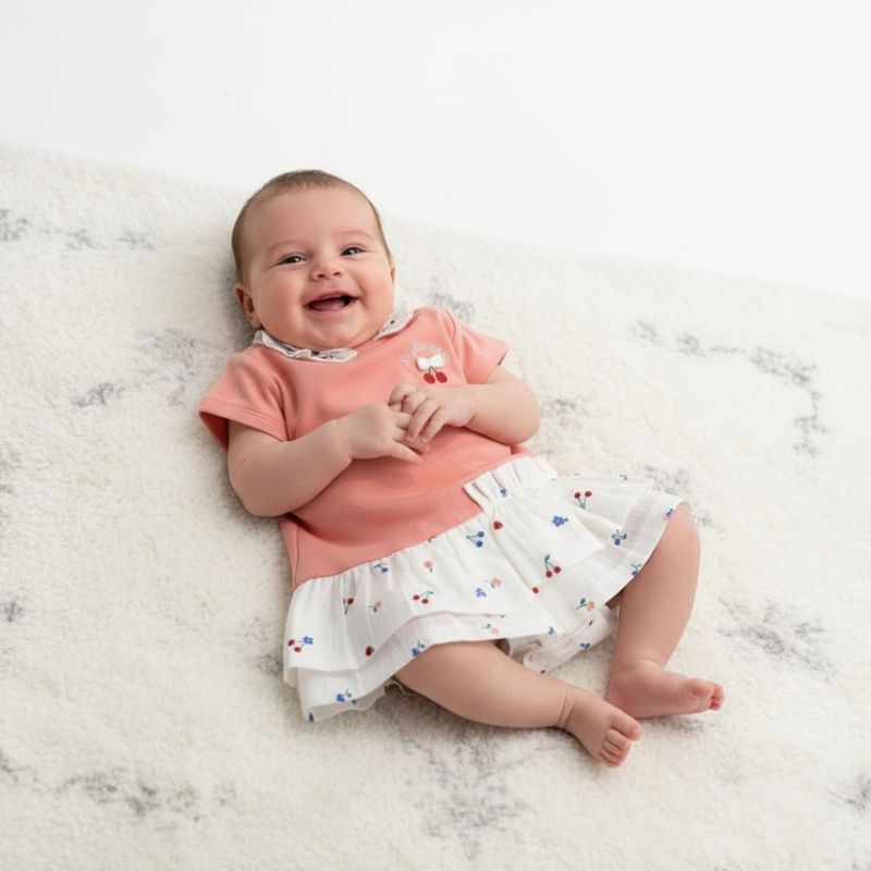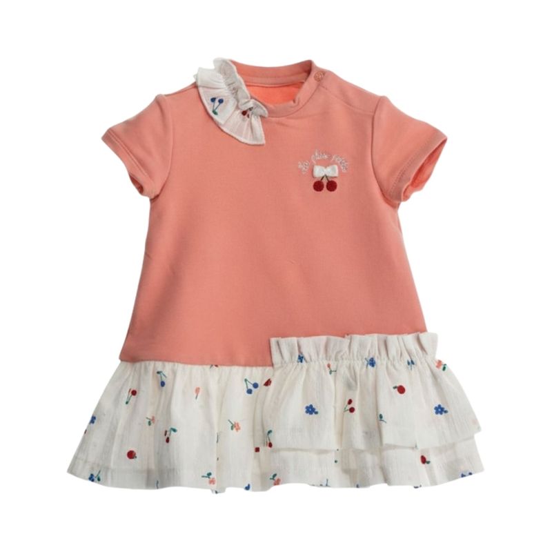 Este encantador vestido de Original Marines combina delicadeza y comodidad para los primeros años de tu bebé. Presenta manga corta y cuello redondo, con un volante decorativo que aporta un toque femenino y elegante. La falda blanca con estampado de cerezas y flores cuenta con dos capas de volantes, creando un efecto dinámico y divertido en cada movimiento. Además, el bordado de cerezas en el pecho refuerza el detalle tierno y característico de la prenda.