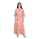 Ideal para fiestas, eventos sociales o salidas especiales, este vestido de estilo maxi combina un estampado floral rosa con naranja, que transmite frescura y alegría, manteniendo un aire elegante y sofisticado.