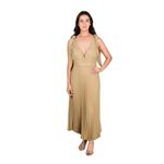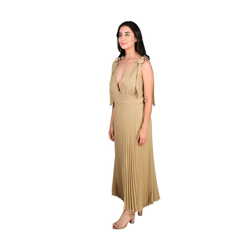 Este vestido midi combina elegancia y sofisticación, ideal para eventos formales o salidas de noche. Su falda plisada y fluida ofrece movimiento y gracia, mientras que la parte superior presenta un escote profundo en V que realza la figura. Los tirantes anudables con lazo permiten un ajuste personalizado y aportan un detalle femenino y delicado.