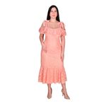 Este vestido combina elegancia y delicadeza, ideal para eventos de día, reuniones familiares o celebraciones especiales. Presenta un escote de hombros descubiertos con volante de encaje que bordea el pecho y los brazos, aportando un toque femenino y romántico. Los tirantes finos incluyen un detalle de lazo en los hombros, realzando la sofisticación del diseño.