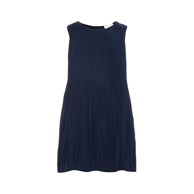 Este elegante vestido sin mangas para niña de la marca Nameit destaca por su sofisticado diseño plisado que aporta movimiento y fluidez a cada paso. La textura plisada vertical recorre toda la tela creando un efecto visual dinámico que añade dimensión y elegancia a la silueta, convirtiendo esta prenda en una opción perfecta para ocasiones especiales.
