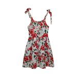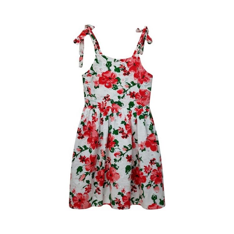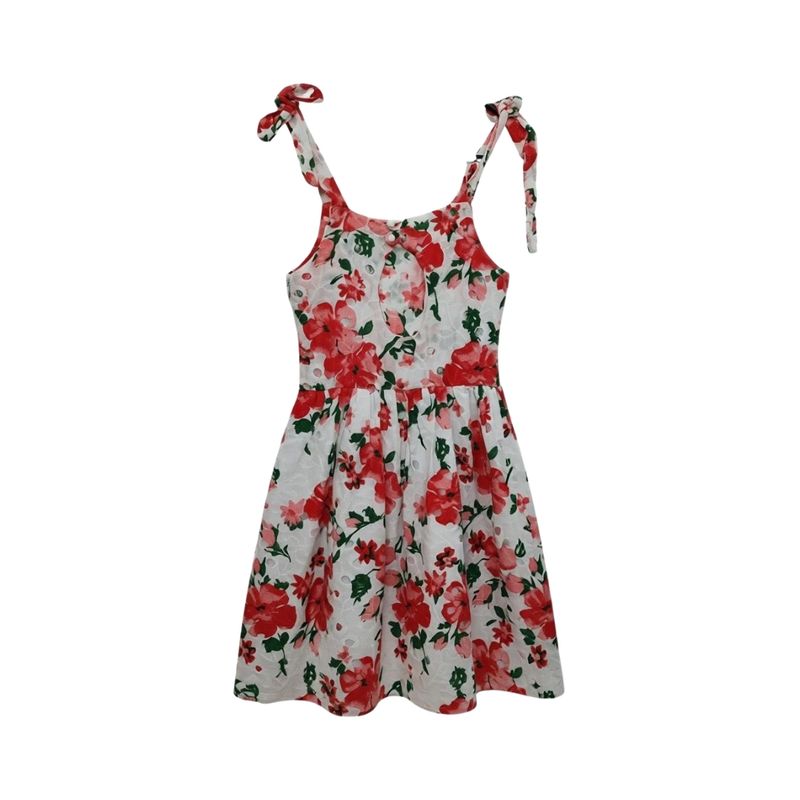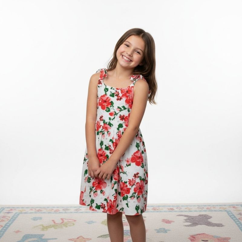 Este vestido sin mangas para niña presenta un diseño fresco y encantador, ideal para los días de calor y las actividades al aire libre. Está confeccionado en una base blanca con estampado de flores rojas y hojas verdes, logrando una estética alegre y delicada. Los tirantes anchos que se anudan en los hombros permiten ajustar el calce de forma práctica y aportan un toque decorativo que realza el estilo solera.