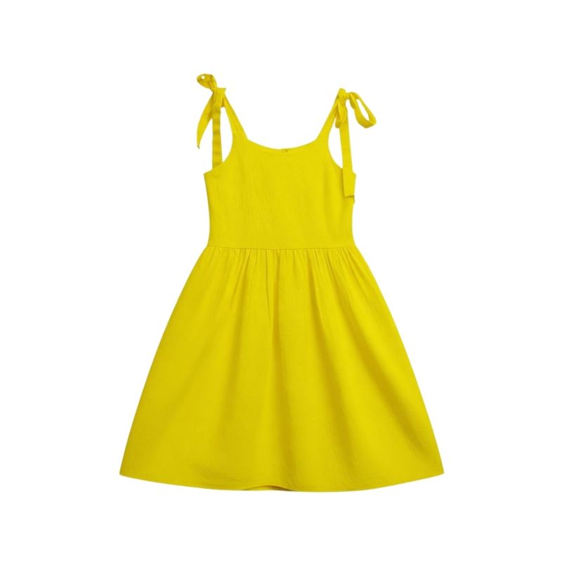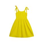 Vestido corto de niña en color amarillo, ideal para un look fresco y veraniego. Cuenta con tirantes de lazo que permiten un ajuste cómodo y delicado, falda fruncida con vuelo que aporta movimiento y feminidad, y detalle de abertura ovalada en la espalda con cierre de botones, combinando practicidad y estilo.