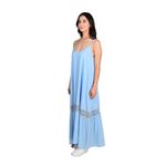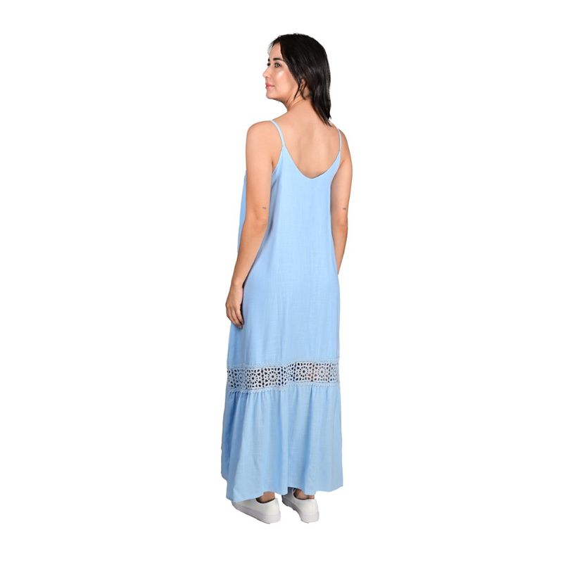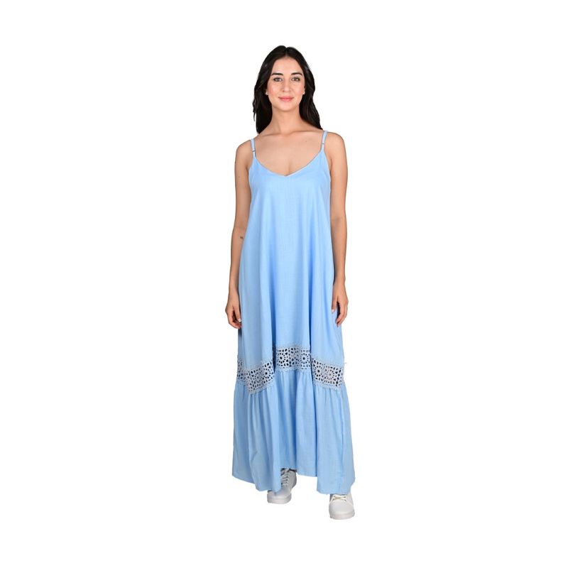El Vestido Solera Amplia Con Randa Celeste Mujer Fashion Celina es una prenda pensada para quienes buscan frescura, comodidad y un estilo naturalmente femenino. Su corte largo, la caída amplia y el escote en V aportan una figura relajada y favorecedora, ideal para días calurosos y para quienes priorizan libertad de movimiento.