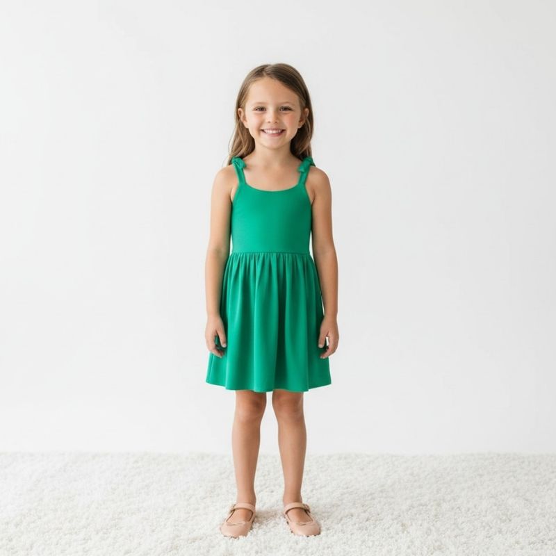 Vestido de niña en color verde, ideal para un look fresco y veraniego. Presenta tirantes de lazo que aportan delicadeza y ajuste cómodo, falda fruncida con vuelo que genera movimiento, y detalle de abertura ovalada en la espalda con cierre de botones, combinando estilo y funcionalidad.
