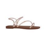 Las delicadas incrustaciones de strass adornan algunas de las tiras, aportando un brillo sutil que realza el diseño sin perder sofisticación. La suela es delgada, en un tono marrón oscuro, y ofrece ligereza y flexibilidad para el uso diario.